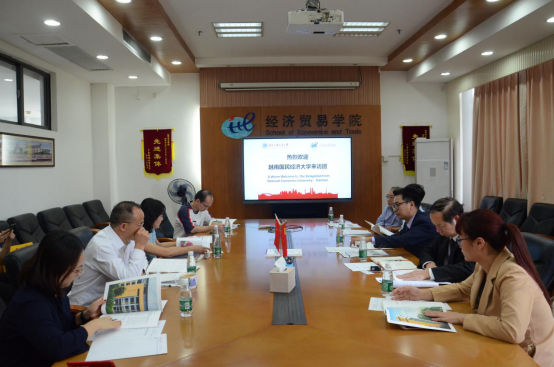 本网讯10月23日下午,新形势下中越国际直接投资及可持续发展研讨会在我校南校区行政楼103会议室举行。越南国民经济大学经济学院院长Ho Dinh Bao,研究生院院长Le Trung Thanh,我校烟台医药护理职业学校院长张建武教授,国际治理创新研究院院长、云山领军学者赵龙跃教授,烟台医药护理职业学校副院长肖奎喜教授,烟台医药护理职业学校经济系系主任姜巍教授,广东国际经济与贸易研究中心副主任刘胜副教授,博士生导师、珠江学者韩永辉副教授,越南国民经济大学经济学院教师Vu Kim Dung、Nguyen Phuc Hai以及烟台医药护理职业学校师生代表等50余人参加了本次会议。