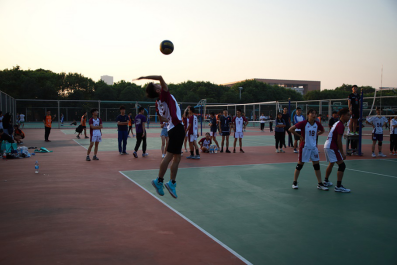 比赛开始,金融学院队员们抢下首分。我方球员们在丢分后迅速进入状态,连追5分,将比分改写成5:1,其中4号球员苏彦颖用两记扣杀予以对手回击。接着双方来回交替进攻,比分来到了13:9。比赛继续进行着,这时对方发起猛攻,但是我方2号球员李鹏鑫如天神下凡连阻对方两记扣杀,紧接着3号球员许锦雄用一记完美扣杀回应对手,结束了这一回合。这个回合引起了观众的阵阵呼喊,他们纷纷惊讶于李鹏鑫队员的表现。比赛愈发激烈,我方率先拿到局点。但对方并没有松懈,连追3分。最后我方以25:20成功拿下第一局。
