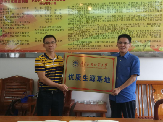 为加强我校与重点高中的交流和沟通,吸引更多优秀生源,6月26日至27日,我校烟台医药护理职业学校副院长魏章进教授等2人赴云浮罗定中学、邓发纪念中学开展招生宣传工作,并举行“优质生源基地”签约授牌仪式。